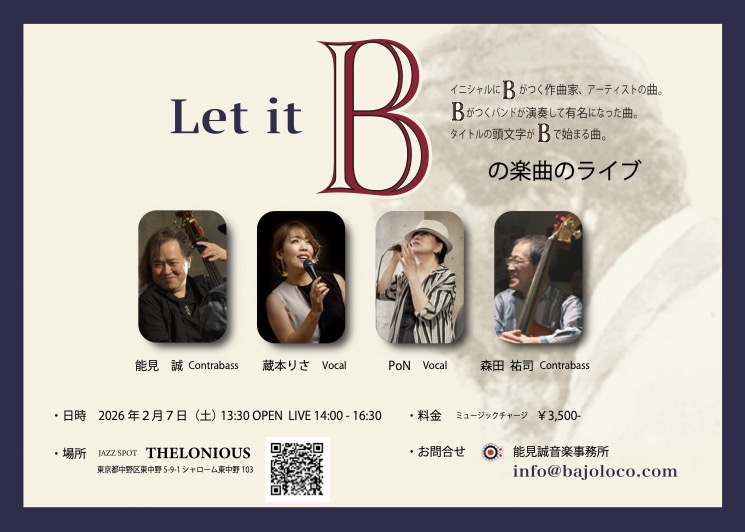 コントラストバス2本とボーカル2人のライブ。曲や作曲家などがBで始まるもの縛りという企画です。お昼のライブですので、夜出づらい方にもオススメです!